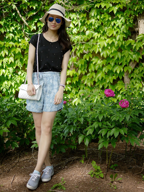 This is possibly the most casual outfit I've blogged about. With the summer days approaching we love to spend our Sundays out and about in the nature exploring with friends. In my ideal world I would be dressed in a maxi dress wherever I go, but no, that would made me look silly when we tread through the forest or across the river... and to me the most fundamental thing about styling is to dress according to the occasion. In this instance, I picked a medium length shorts that's not too scandalous, and a practical loose t-shirt that will protect me from the UV rays. I tend to avoid cami for as long as I can before the weather gets too unbearably hot. Just because I'm paranoid about getting burned, getting sun spots and wrinkles etc...